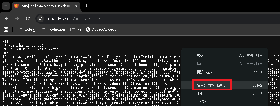 apexcharts.js のCDNページ(https://cdn.jsdelivr.net/npm/apexcharts)をWebブラウザで表示し、ページ内を右クリックして「名前を付けて保存」を選択。