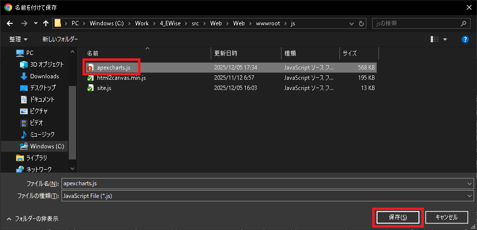 Webサイトのローカルソースコードから wwwroot\js\apexcharts.js を選択し「保存」をクリック。これでローカルの apexcharts.js は最新版に更新されます。