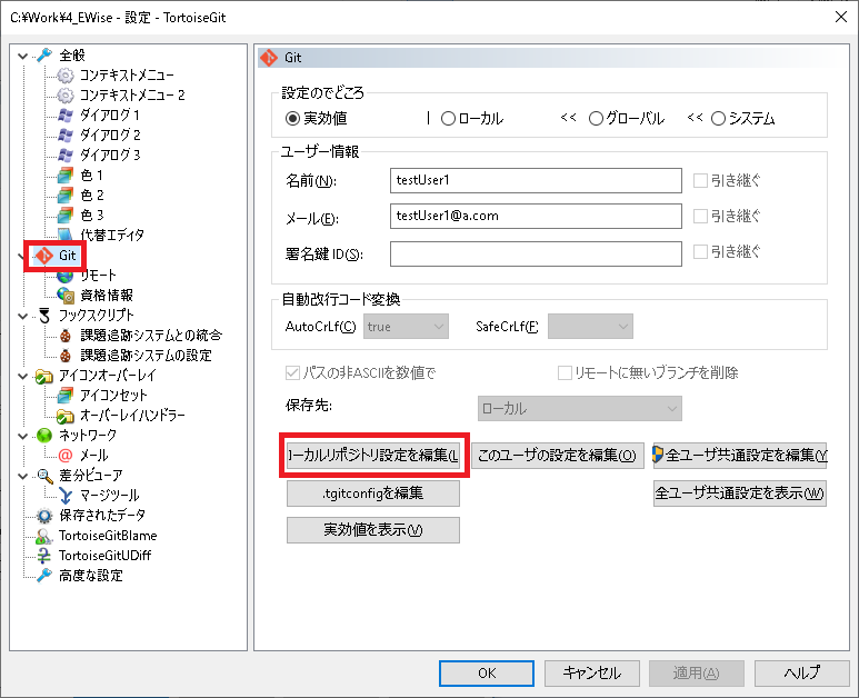 「Git」の「ローカルリポジトリ設定を編集」をクリック。
