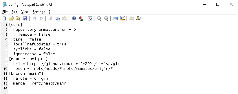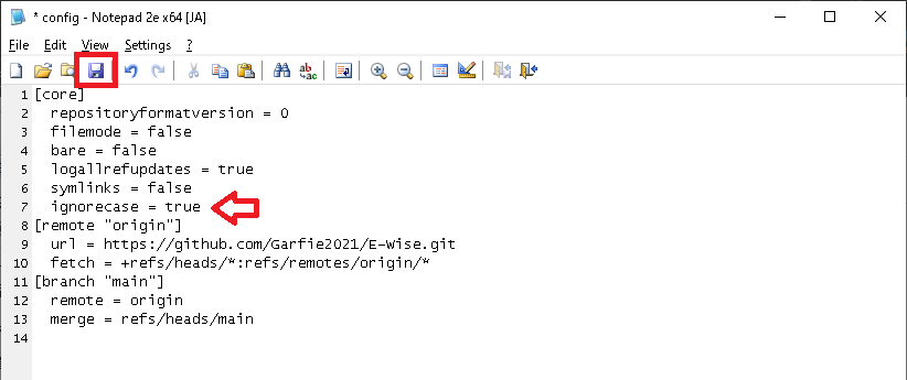 「core > ignorecase」を true から false へ変更し、保存ボタンをクリック。